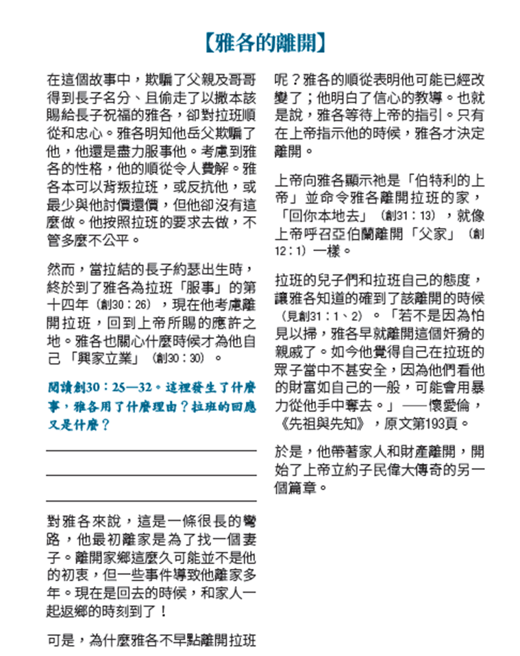 只有當 上帝告訴他離開拉班的家,回到迦南地的時候,他才開始回家。