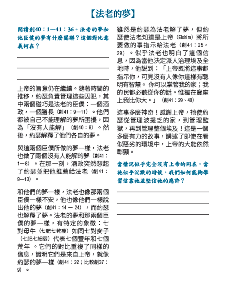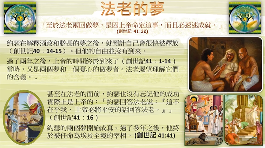 最後約瑟來到幫他解夢,他在法老的面前,約瑟也沒有忘記他的成功,實際上是 上帝的。