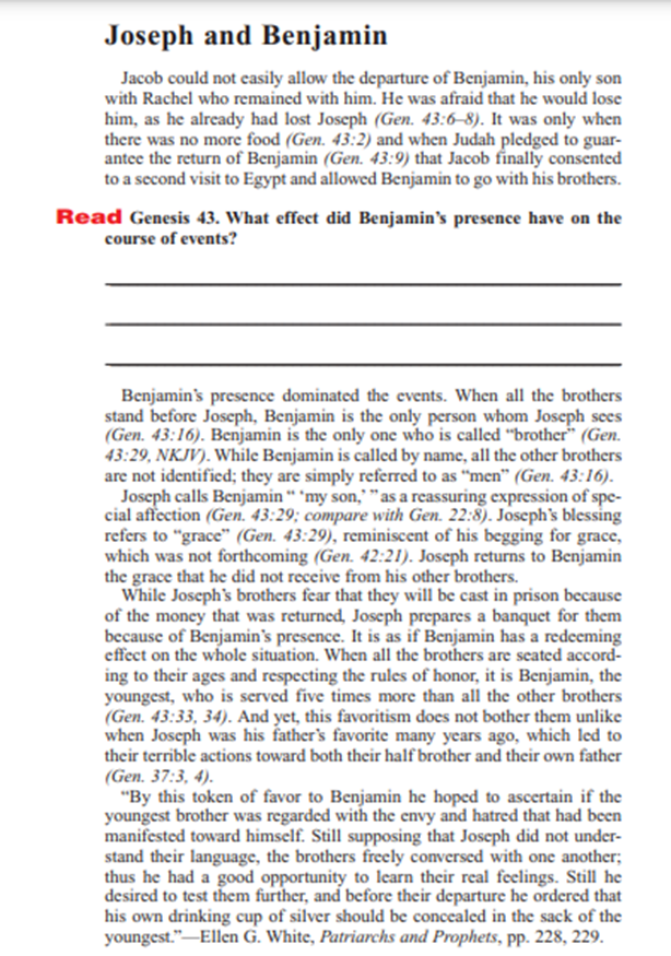 ( 創世記四十三章三十四節: 約瑟把他面前的食物分出來,送給他們;但便雅憫所得的比別人多五倍。他們就飲酒,和約瑟一同宴樂。、三十七章三節: 以色列原來愛約瑟過於愛他的眾子,因為約瑟是他年老生的;他給約瑟做了一件彩衣。)