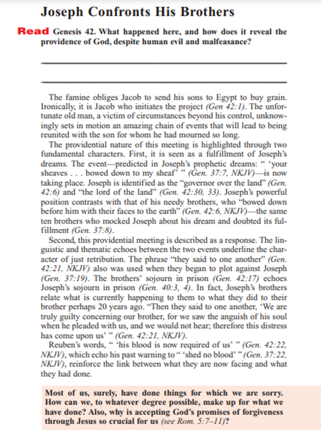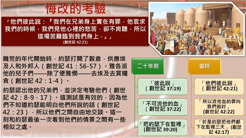 二十年後的這一個時刻,他們在約瑟面前彼此說 (創世記四十二章二十一節) :「我們在兄弟身上實在有罪。他哀求我們的時候,我們見他心裏的愁苦,卻不肯聽,所以這場苦難臨到我們身上。」