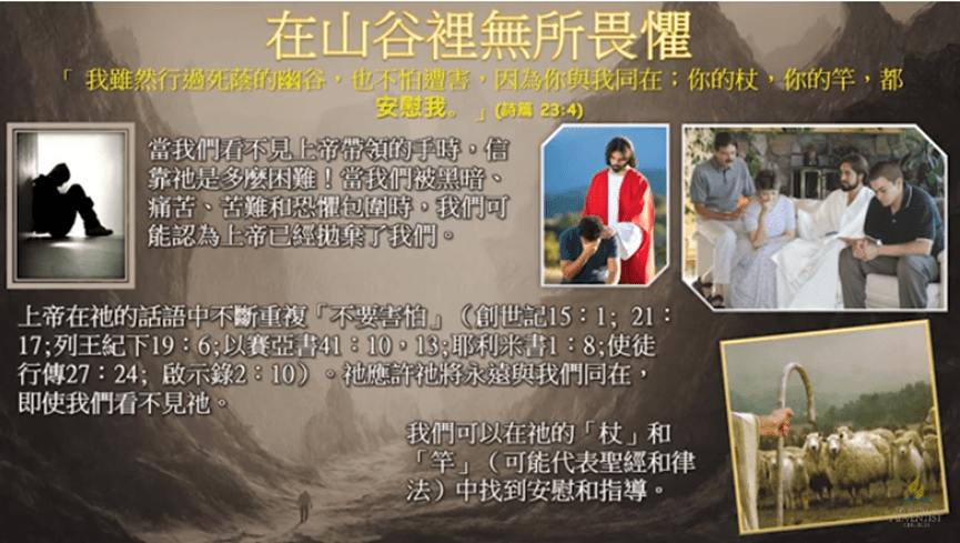 上帝應許 祂永遠與我們同在,即使我們看不見 祂的時候。我們要記得: 我們可以在祂的「杖」和「竿」裡面找到安慰和指導。