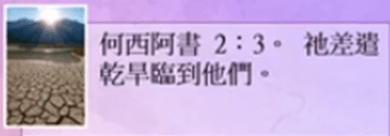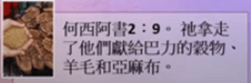 何西阿書 2 章 9 節: 因此到了收割的日子,出酒的時候,我必將我的五穀、新酒收回,也必將她應當遮體的羊毛和麻奪回來。