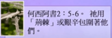 何西阿書 2 章 5、6 節: 5 他們的母親行了淫亂,懷他們的母做了可羞恥的事,因為她說:我要隨從所愛的;我的餅、水、羊毛、麻、油、酒 都是他們給的。6 因此,我必用荊棘堵塞她的道,築牆擋住她,使她找不着路。