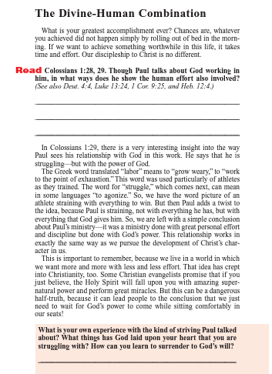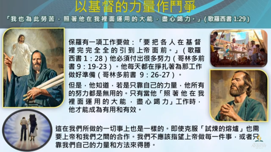 正如他在歌羅西書一章二十九節所說 : 只有當他「照著 上帝在我裏面運用的大能,盡心竭力」工作時,他才能成為有用和有效。 這一點在我們所做的一切事上也是一樣的。即使克服「試煉的熔爐」也需要 上帝和我們之間的合作。我們不應該指望 上帝做每一件事,或者只靠我們自己的力量和方法來得勝。