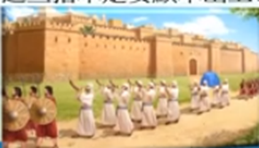 (約書亞記 6 章 12至16 節: 12 約書亞清早起來,祭司又擡起 耶和華的約櫃。 13 七個祭司拿七個羊角在 耶和華的約櫃前,時常行走吹角;帶兵器的在他們前面走,後隊隨着 耶和華的約櫃行。祭司一面走一面吹。 14 第二日,眾人把城繞了一次,就回營裏去。六日都是這樣行。15 第七日清早,黎明的時候,他們起來,照樣繞城七次;惟獨這日把城繞了七次。 16 到了第七次,祭司吹角的時候,約書亞吩咐百姓說:「呼喊吧,因為 耶和華已經把城交給你們了!20 節 : 於是百姓呼喊,祭司也吹角。百姓聽見角聲,便大聲呼喊,城牆就塌陷,百姓便上去進城,各人往前直上,將城奪取;)