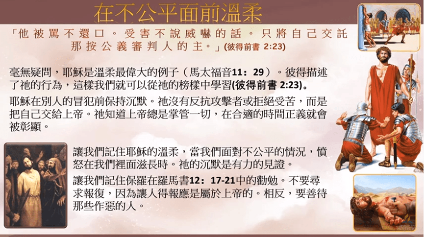 讓我們記住 耶穌的溫柔,當我們面對不公平的情況,憤怒在我們裏面滋長的時候,我們要記住 耶穌的溫柔,耶穌的沉默是有力的見證。