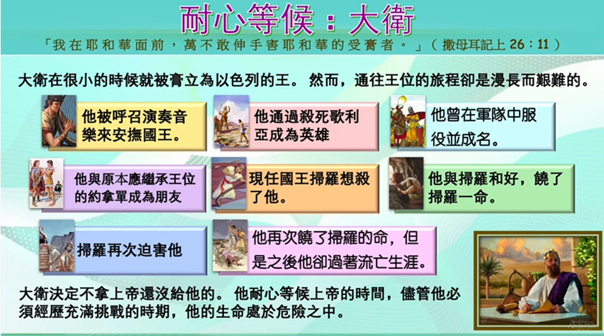 他耐心等候 上帝的時間,儘管他必須經歷充滿挑戰的時期,甚至他的生命處於危險之中,他仍然忍耐等候。