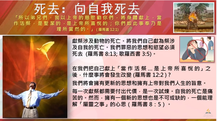 ( 羅馬書 8 章 13 節: 你們若順從肉體活着,必要死;若靠着 聖靈治死身體的惡行,必要活着。 、歌羅西書3章5節 : 所以,要治死你們在地上的肢體,就如淫亂、污穢、邪情、惡慾,和貪婪〈貪婪就與拜偶像一樣〉。)