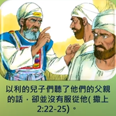 撒母耳記上 2:22-25 22 以利年甚老邁,聽見他兩個兒子待以色列眾人的事,又聽見他們與會幕門前伺候的婦人苟合, 23 他就對他們說:「你們為何行這樣的事呢?我從這眾百姓聽見你們的惡行。 24 我兒啊,不可這樣!我聽見你們的風聲不好,你們使 耶和華的百姓犯了罪。 25 人若得罪人,有士師審判他;人若得罪 耶和華,誰能為他祈求呢?」然而他們還是不聽父親的話,因為 耶和華想要殺他們。