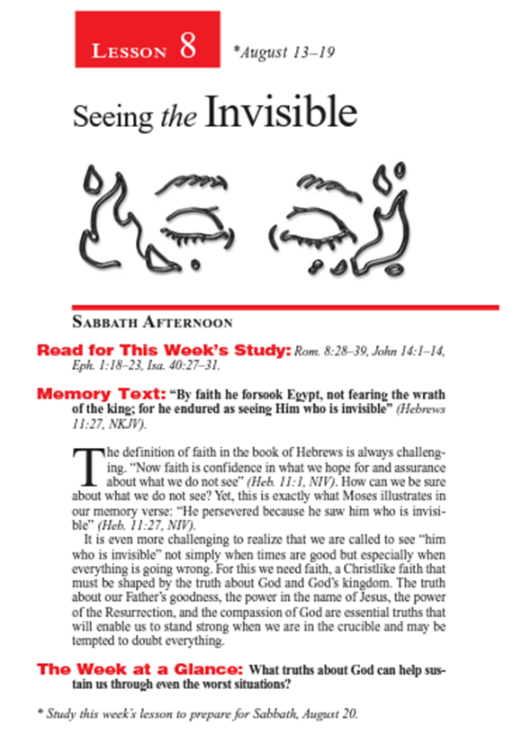 (希伯來書 11 章 27 節: 他因着信,就離開埃及,不怕王怒;因為他恆心忍耐,如同看見那不能看見的 主。)